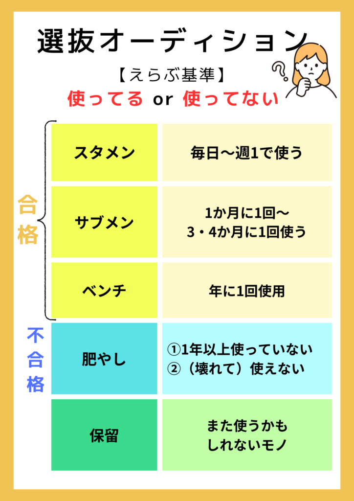 そこでまず、「使っているか」「使っていないか」を基準に肥やしを取り除き、あなただけの選抜メンバーを選ぶことからはじめてみてください。