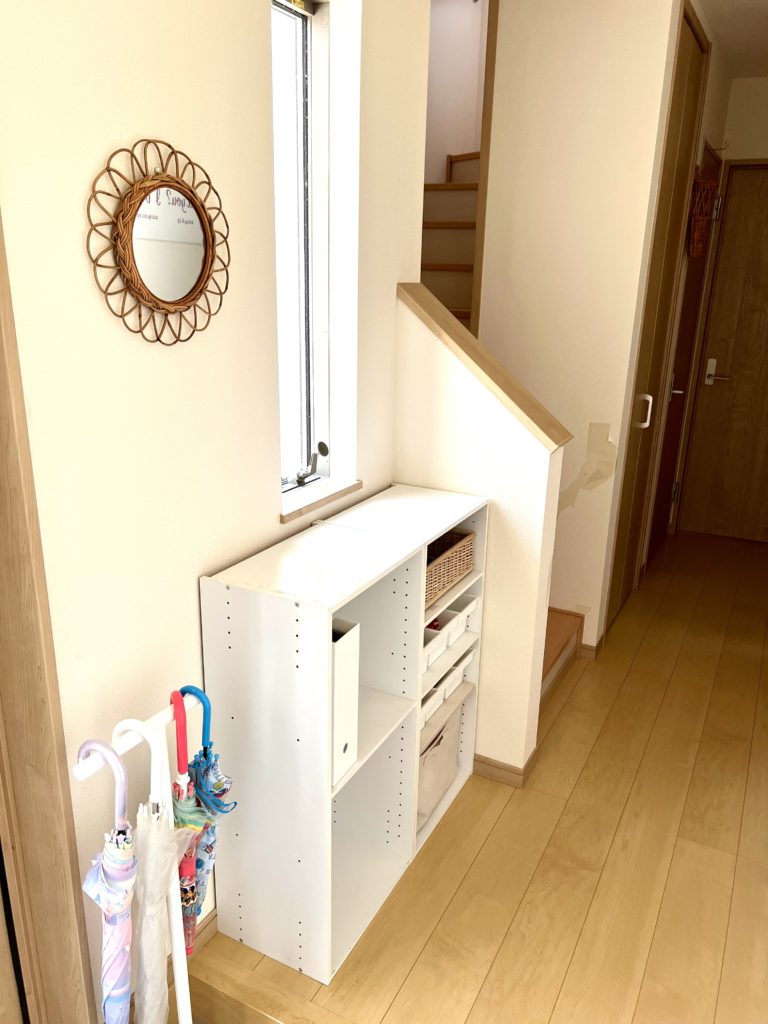 わが家の身支度コーナー@玄関。ここにこどもの靴下、ハンカチ、ティッシュ、ポーチ、ランドセル、教科書を収納しています。おかげで忘れ物をしても玄関で解決★
