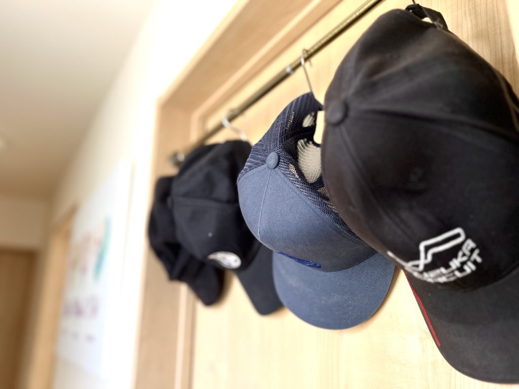 玄関にかけて収納している帽子。