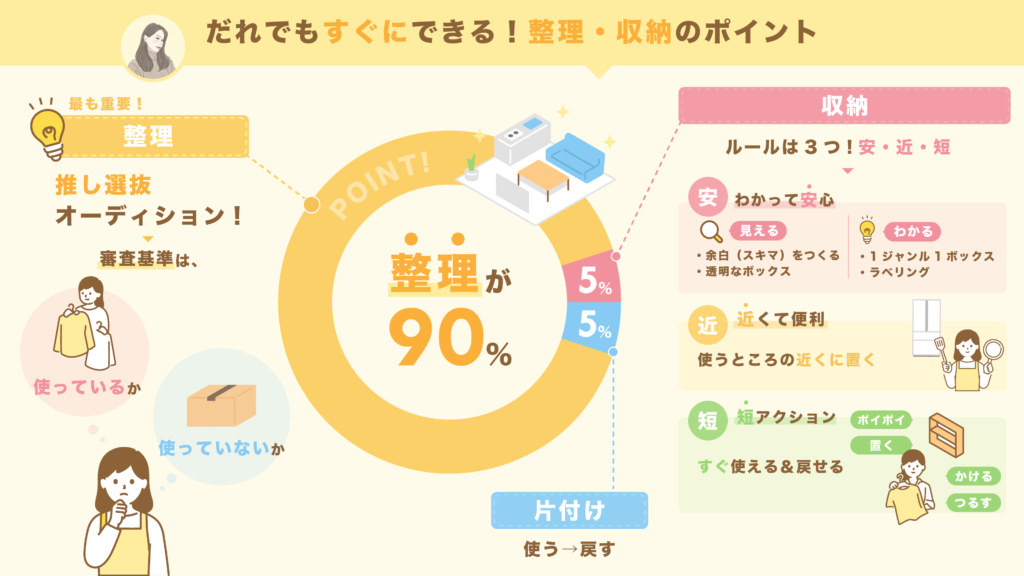 というワケで、さっこん増え続けている「片づけ難民」の方むけに、押さえておくべき「整理・収納のポイント」が一目でわかる図解を作ってみました。