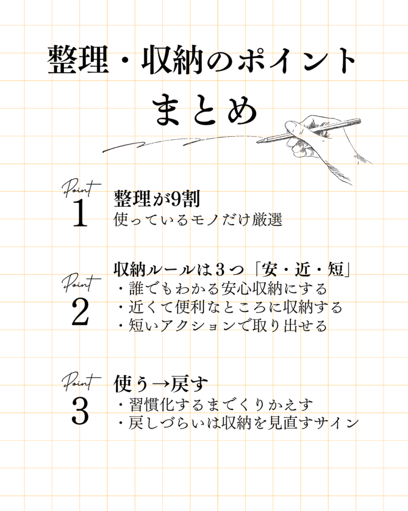 もし、「なんか戻しづらい」「なんかめんどうくさい」と思ったら、定位置を見直すサインです。戻しづらい原因を見つけ、ベストな定位置を改めて考えてみてください。