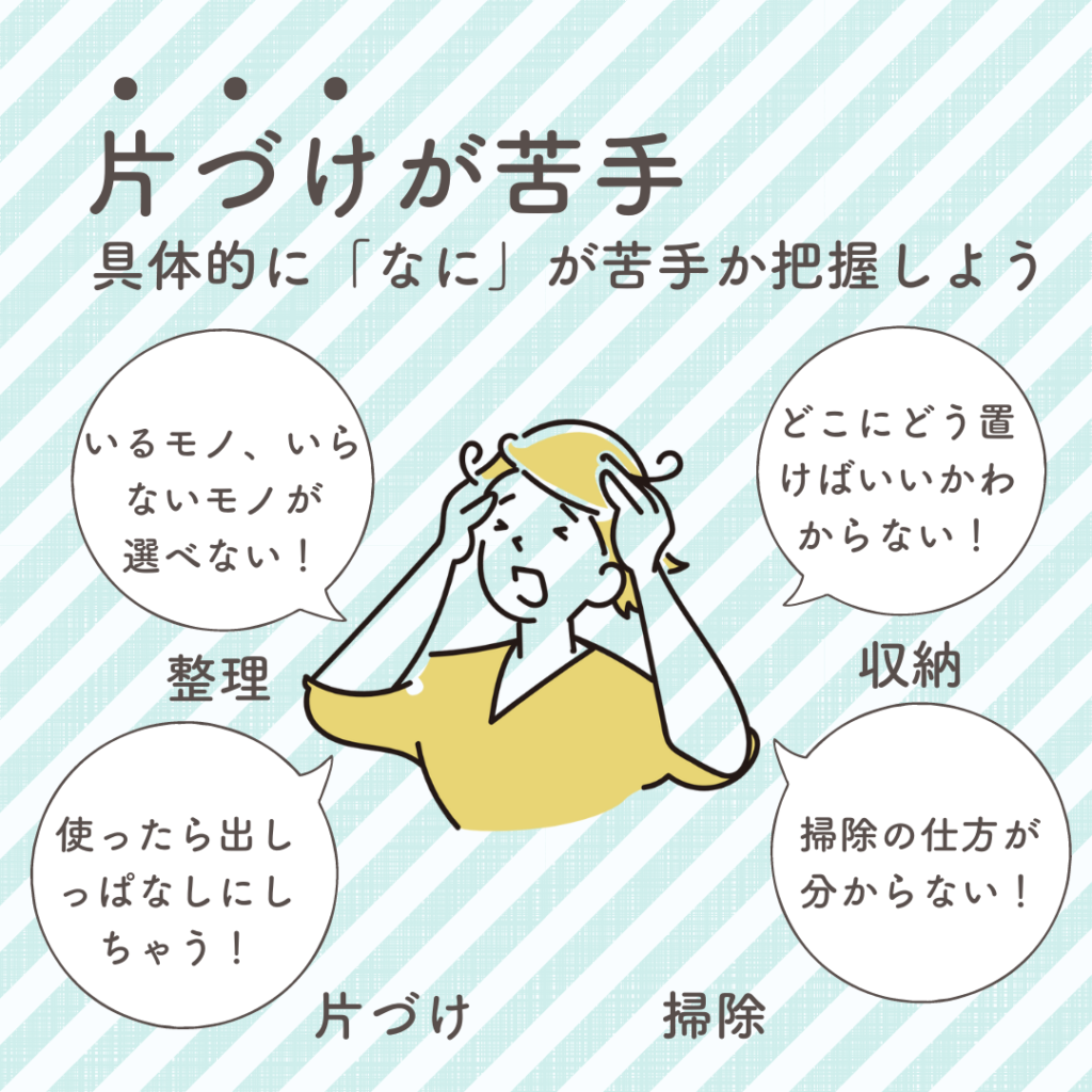 「片付けが苦手だ」という人は、それが整理なのか、収納なのか、片づけなのか、掃除なのか、“なにが”苦手か、しっかり把握して理解するのが克服への一歩になります。