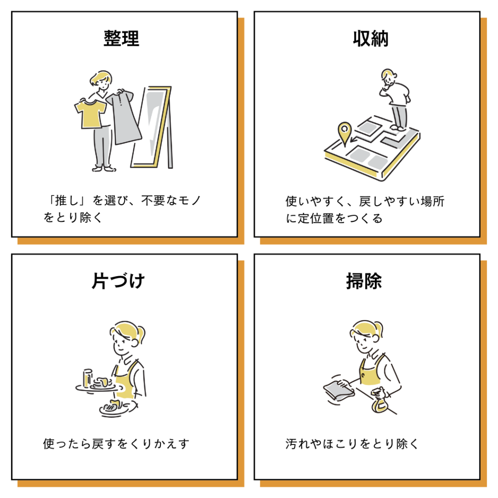 片づけには、整理、収納、片づけ、掃除の4つのプロセスがあります。